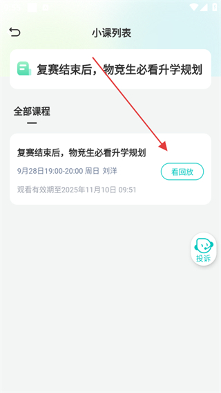 3、進入課程詳情頁面后,找到對應(yīng)課程章節(jié),點擊看回放按鈕。