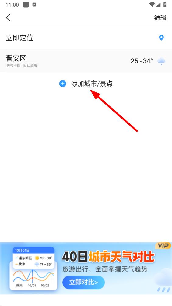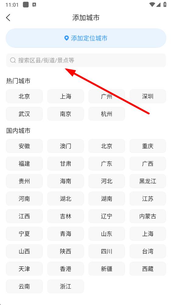 3、在添加城市頁面,可通過點(diǎn)擊添加定位城市快速添加當(dāng)前定位城市,也可以在搜索框內(nèi)輸入?yún)^(qū)縣、街道或景點(diǎn)等關(guān)鍵詞進(jìn)行搜索。