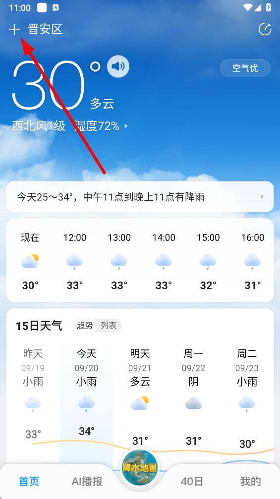 1、打開15日天氣預(yù)報(bào)應(yīng)用,點(diǎn)擊界面左上角加號標(biāo)識的按鈕,進(jìn)入添加城市相關(guān)界面。
