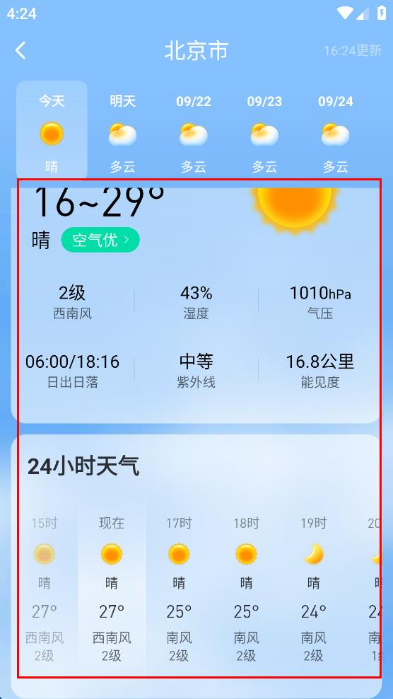 4、在詳細(xì)天氣信息頁面,即可查看包括溫度、天氣狀況、風(fēng)力、濕度等在內(nèi)的全面天氣數(shù)據(jù),以及24小時天氣變化情況。