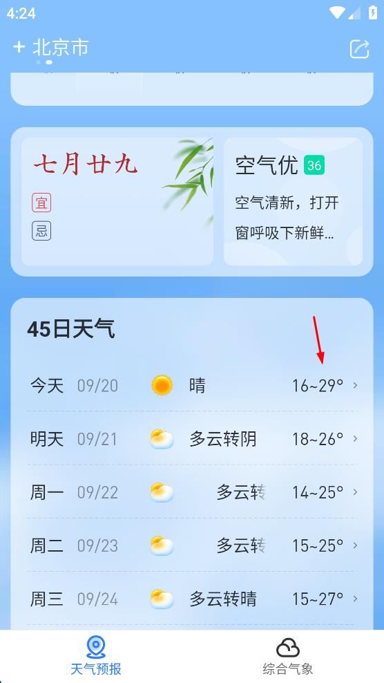 3、在北京市天氣頁面,找到“45日天氣”板塊,點擊當(dāng)天天氣欄(如顯示“今天 09/20 晴 16~29°”的欄),進(jìn)入更詳細(xì)的天氣信息頁面。