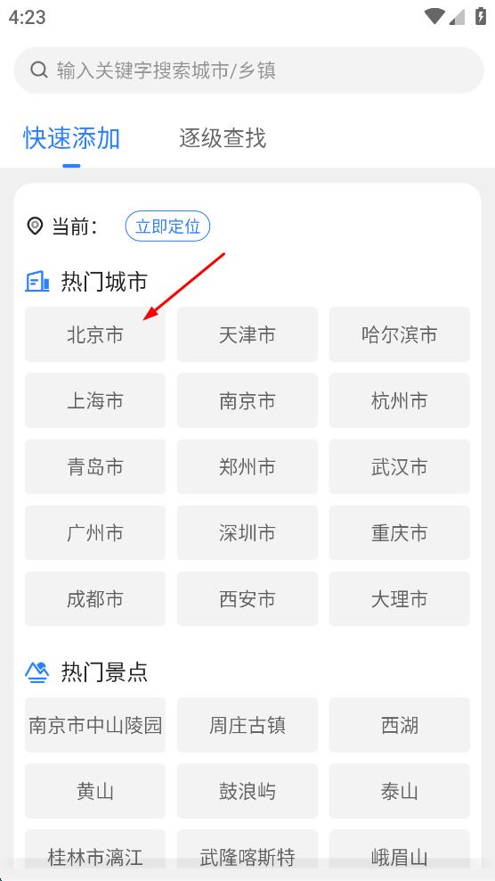 2、在城市選擇頁面,可通過“快速添加”下的熱門城市選擇,比如點擊“北京市”,進(jìn)入北京市天氣頁面。