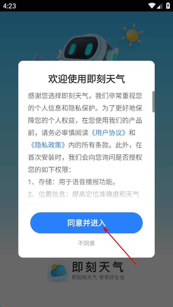 1、打開即刻天氣APP,在彈出的“歡迎使用即刻天氣”提示框中,點擊“同意并進(jìn)入”按鈕,進(jìn)入城市選擇頁面。