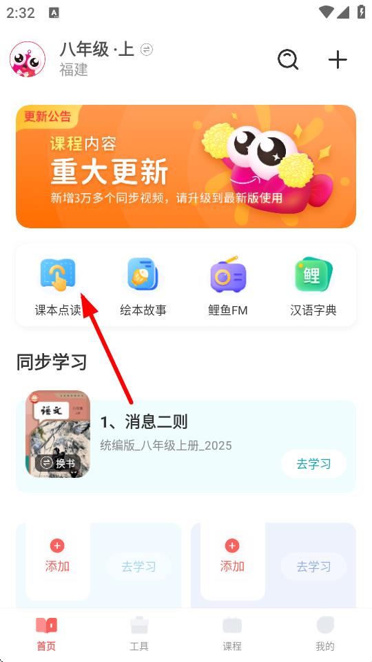 1、打開(kāi)鯉魚輔導(dǎo)首頁(yè),點(diǎn)擊底部課本點(diǎn)讀進(jìn)入我的書架界面。
