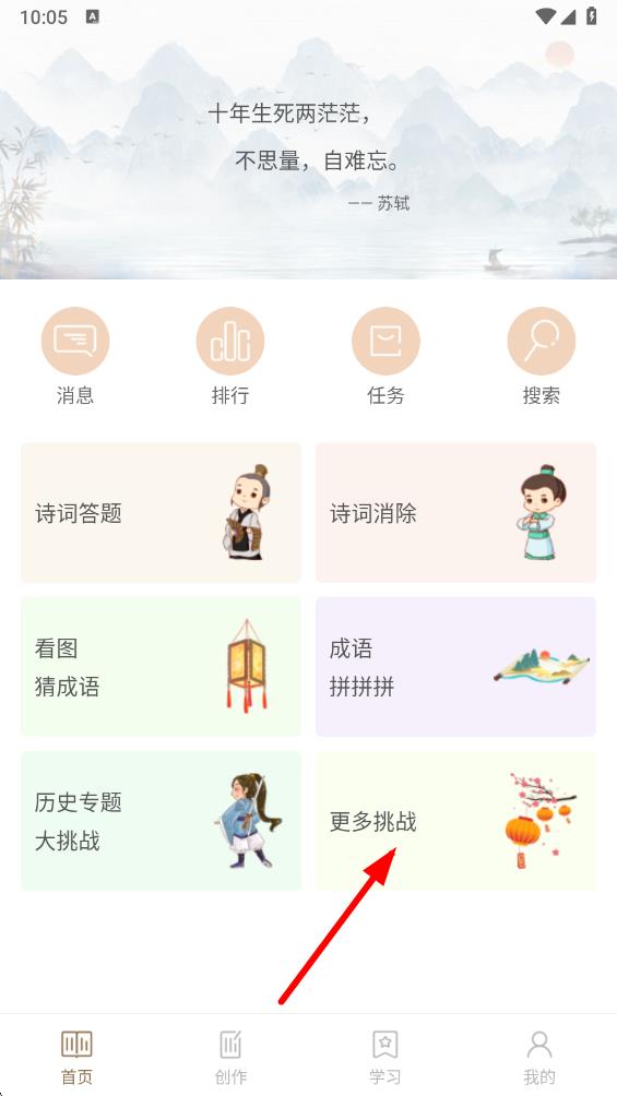 1、打開(kāi)詩(shī)詞天地app,在首頁(yè)點(diǎn)擊更多挑戰(zhàn)選項(xiàng)。