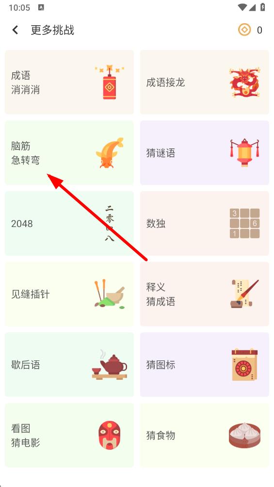 2、在更多挑戰(zhàn)頁(yè)面中,找到并點(diǎn)擊腦筋急轉(zhuǎn)彎選項(xiàng)。