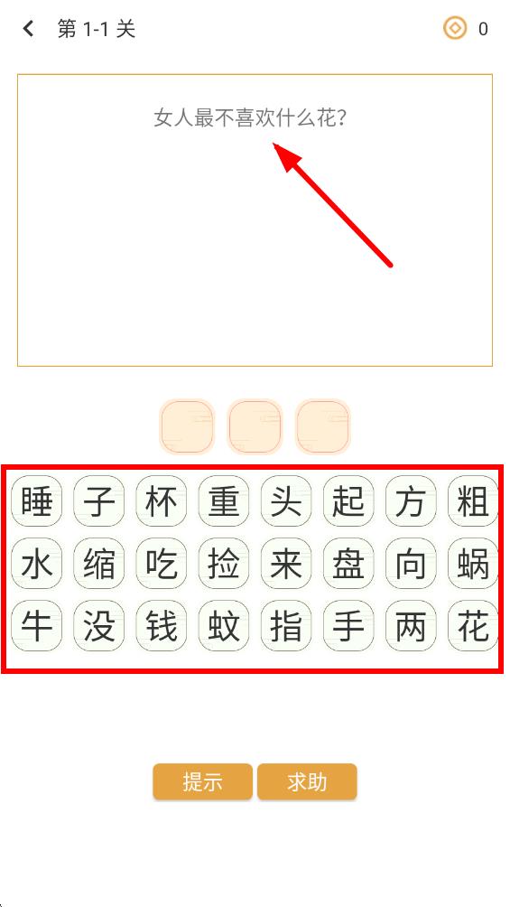 4、在關(guān)卡界面,閱讀題目?jī)?nèi)容,然后從下方字板中點(diǎn)擊選擇合適的漢字組成答案來(lái)完成答題。