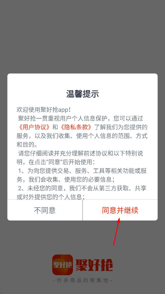 1、打開聚好搶app,會彈出溫馨提示頁面,提示可通過用戶協(xié)議和隱私條款了解服務(wù)及個人信息相關(guān)情況,仔細閱讀后,若同意,點擊“同意并繼續(xù)”按鈕。