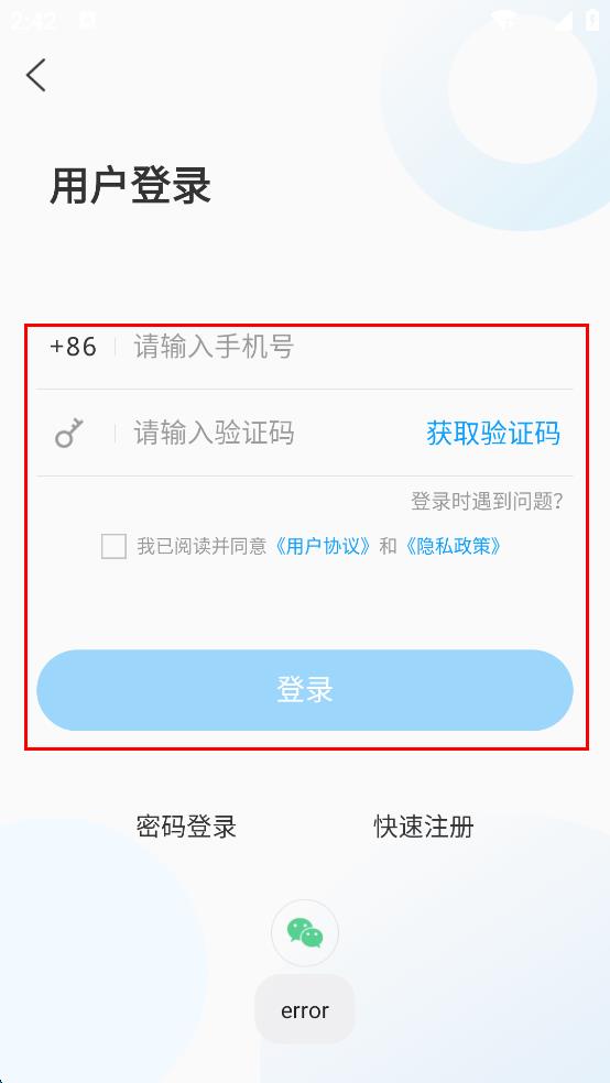 4、在用戶登錄頁面,輸入手機(jī)號,點(diǎn)擊“獲取驗(yàn)證碼”,收到后輸入驗(yàn)證碼,勾選相關(guān)協(xié)議,點(diǎn)擊“登錄”按鈕完成登錄。