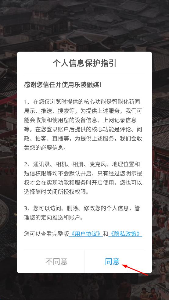 1、打開樂陵融媒APP,出現(xiàn)個人信息保護(hù)指引界面,仔細(xì)閱讀后點(diǎn)擊“同意”,進(jìn)入主界面。