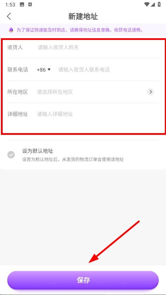 5、按提示填寫收貨人姓名、聯(lián)系電話、所在地區(qū)和詳細地址后,點擊保存即可。