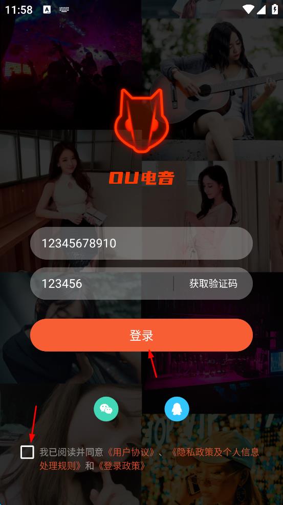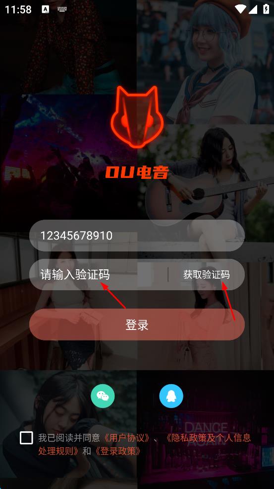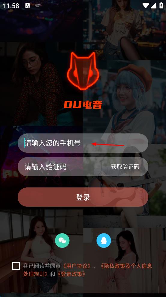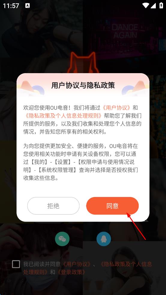 1、打開OU電音,會(huì)出現(xiàn)用戶協(xié)議與隱私政策界面,仔細(xì)閱讀后點(diǎn)擊“同意”,進(jìn)入登錄頁面。