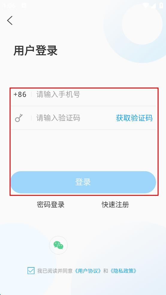 4、在用戶登錄界面輸入手機(jī)號(hào),點(diǎn)擊獲取驗(yàn)證碼,輸入驗(yàn)證碼后點(diǎn)擊登錄,完成登錄操作。