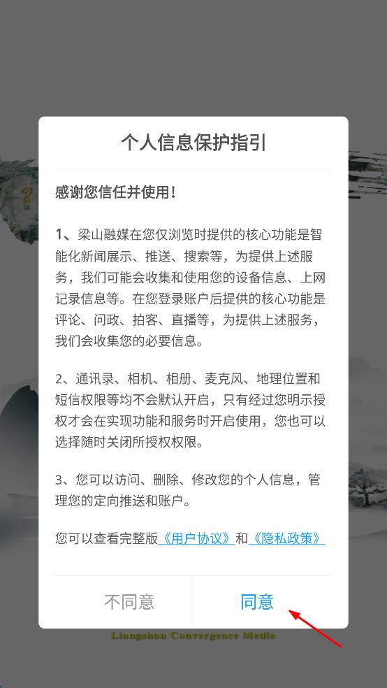 1、打開梁山融媒,彈出個(gè)人信息保護(hù)指引,點(diǎn)擊同意,進(jìn)入軟件首頁(yè)。