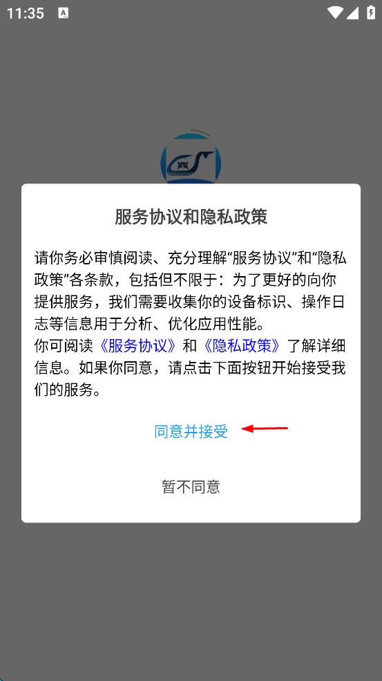 1、打開該政務(wù)類APP,會出現(xiàn)服務(wù)協(xié)議和隱私政策界面,仔細閱讀后點擊“同意并接受”,進入登錄頁面。