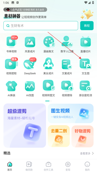 1、打開素材神器APP,在首頁點(diǎn)擊文生圖功能圖標(biāo),進(jìn)入文生圖創(chuàng)作界面。