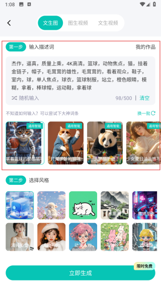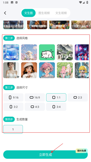 3、在選擇風(fēng)格區(qū)域挑選風(fēng)格,在選擇尺寸,設(shè)置生成數(shù)量,完成所有設(shè)置后,點(diǎn)擊立即生成按鈕。
