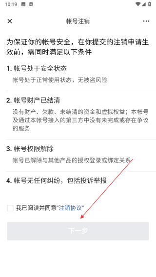 4、進(jìn)入賬號(hào)注銷頁面后,查看并確認(rèn)賬號(hào)滿足注銷條件,勾選我已閱讀并同意注銷協(xié)議,然后點(diǎn)擊下一步。
