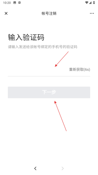 5、在輸入驗(yàn)證碼頁面,輸入賬號(hào)綁定手機(jī)號(hào)收到的驗(yàn)證碼,點(diǎn)擊下一步即可注銷。