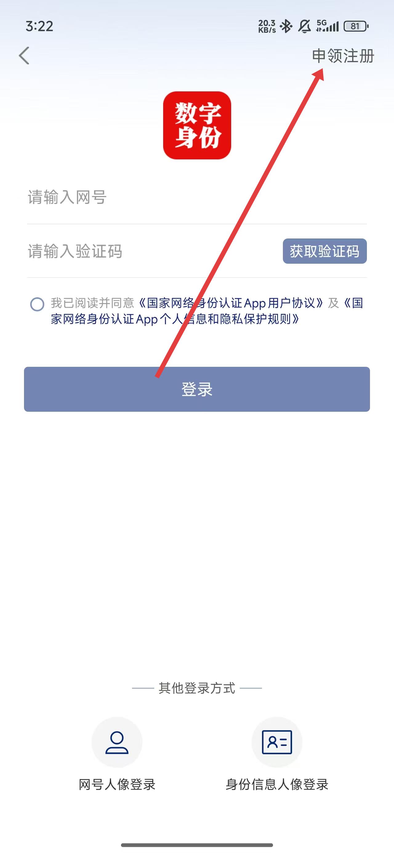 3、在進(jìn)入到登錄頁(yè)面后,若沒(méi)有賬號(hào)可以點(diǎn)擊右上角申領(lǐng)注冊(cè)按鈕,進(jìn)行注冊(cè)。