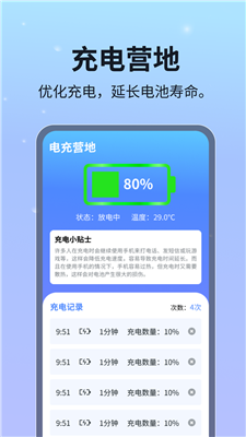 電充營地app是一款專門給安卓設(shè)備打造的充電輔助工具,日常充電的次數(shù)以及時間都會自動存儲,并且完全不會出現(xiàn)對電池的損害,不定期帶來各種正確操作的教程,以便讓大家能夠感受到電池健康的變化,不僅如此,設(shè)備還能隨時清理一些緩存,以便保障設(shè)備長期的運行流暢,每天大家使用的網(wǎng)絡(luò)都會生成流量統(tǒng)計,并且有無線網(wǎng)絡(luò)和移動網(wǎng)絡(luò)的區(qū)分,輕松就能讓用戶了解的更加直觀,日常想要維護設(shè)備的用戶快來下載吧!