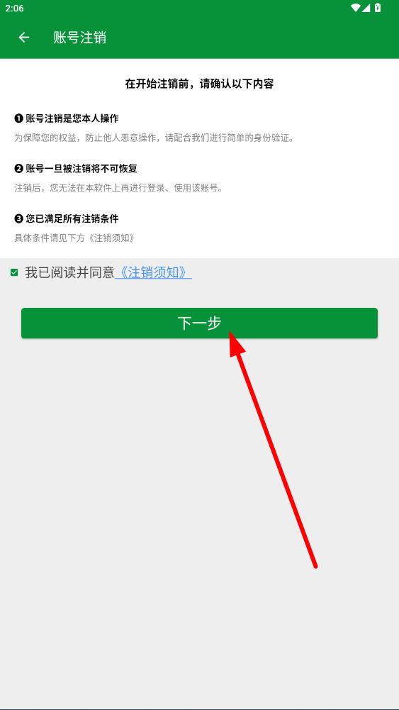 4、在賬號(hào)注銷頁面,閱讀相關(guān)內(nèi)容后,然后點(diǎn)擊下一步,按照提示完成身份驗(yàn)證等操作,即可注銷賬號(hào)。