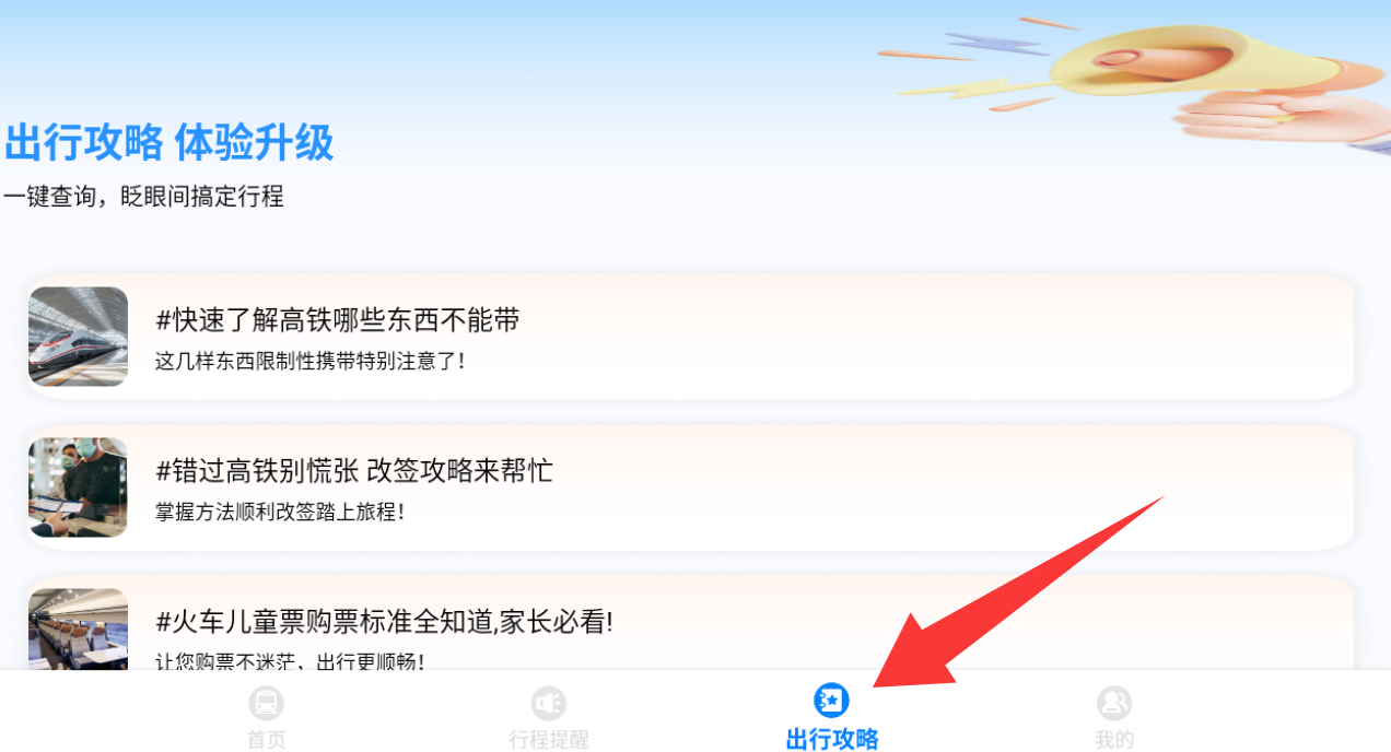3、"出行百科"板塊收錄300+篇實(shí)用攻略,內(nèi)容涵蓋乘車須知、車站導(dǎo)覽、沿線景點(diǎn)等,支持離線下載閱讀,特別設(shè)置"春運(yùn)專區(qū)"和"學(xué)生專區(qū)",滿足不同人群的特殊需求。