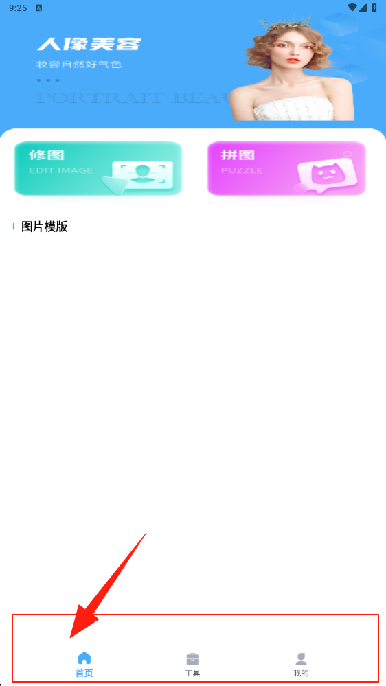 1、在首頁可選擇修圖或拼圖功能,利用圖片模版開展人像美容相關(guān)的圖片處理操作,點(diǎn)擊選擇類型。