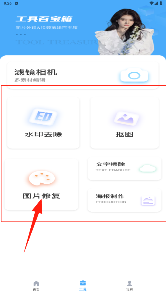 2、切換到工具頁,在工具百寶箱中點(diǎn)擊圖片修復(fù)功能,對(duì)模糊或損壞圖片進(jìn)行修復(fù)處理。