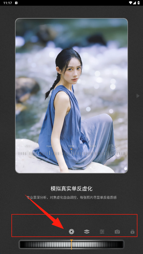 1、在攝影界面,利用底部功能按鈕,調(diào)節(jié)模擬真實(shí)單反虛化效果,打造專業(yè)景深照片質(zhì)感。
