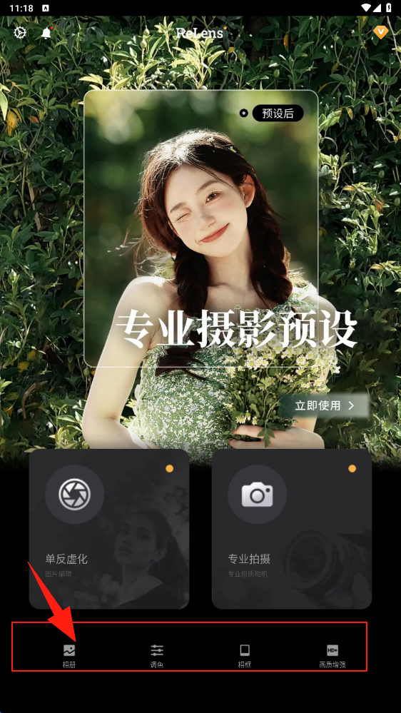 2、進(jìn)入專業(yè)攝影預(yù)設(shè)頁面,點(diǎn)擊相冊(cè)功能,可從手機(jī)相冊(cè)選取照片,應(yīng)用專業(yè)攝影預(yù)設(shè)效果。