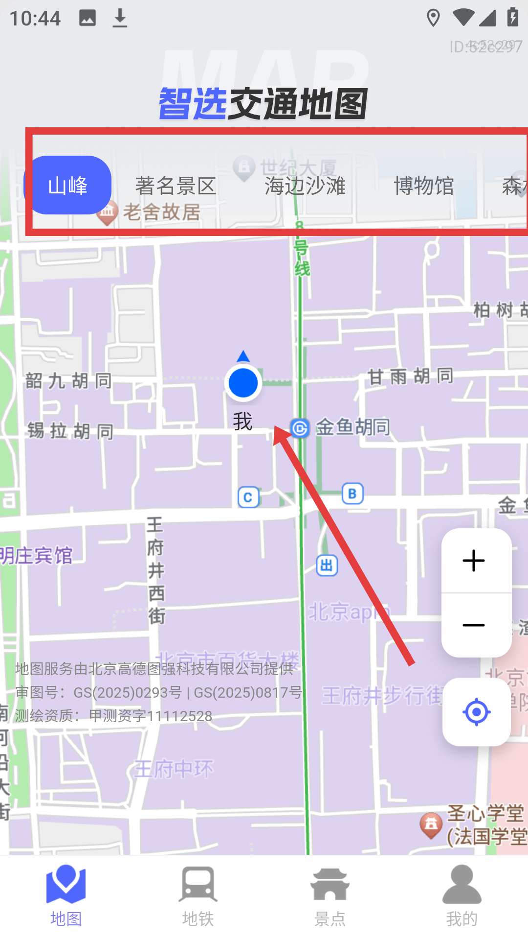1、這是智選交通地圖的界面,能看到當(dāng)前位置周邊的地理信息,頂部有山峰,著名景區(qū)等分類標(biāo)簽,你可以點(diǎn)擊這些標(biāo)簽,查看對應(yīng)類別的地點(diǎn)分布,方便找到想去的地方。