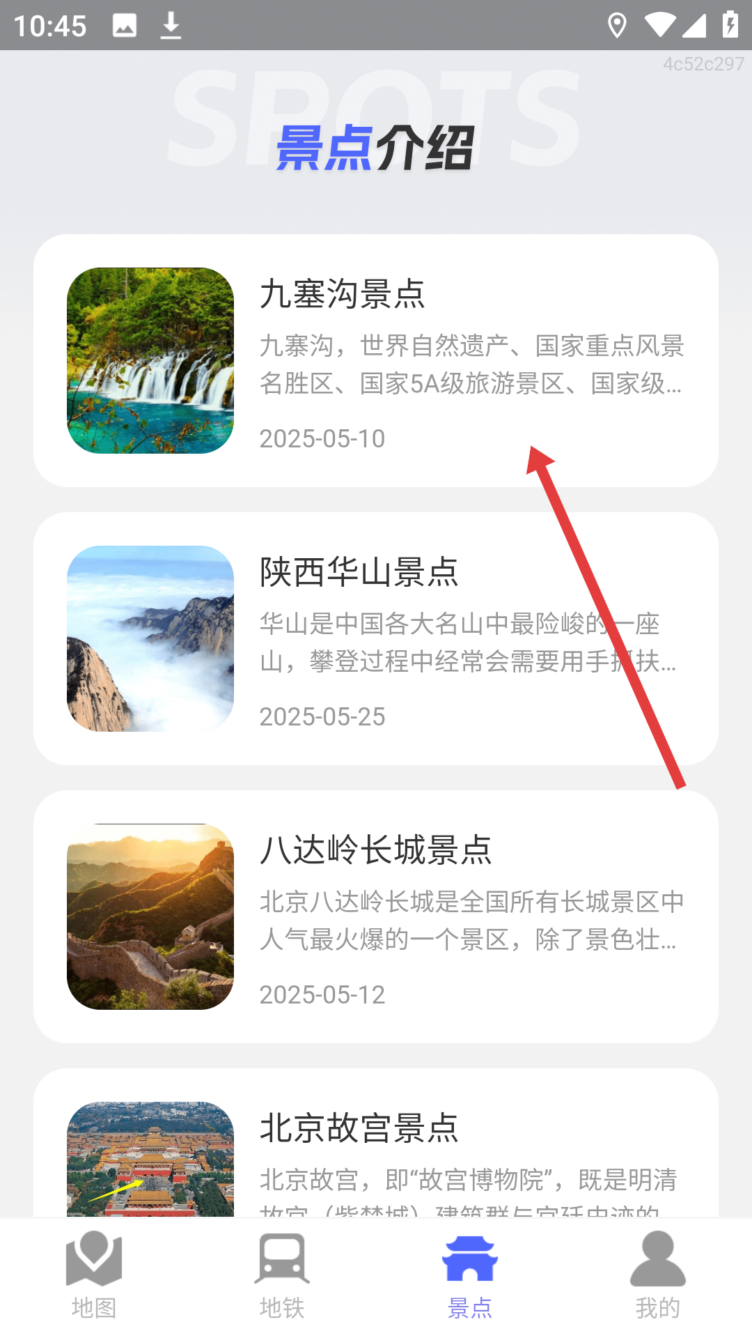 3、這個(gè)景點(diǎn)介紹頁面,展示了九寨溝、華山等多個(gè)景點(diǎn)的信息,每個(gè)景點(diǎn)都有簡單的介紹和發(fā)布時(shí)間,你可以瀏覽這些內(nèi)容,了解不同景點(diǎn)的特色,為出行游玩做參考。