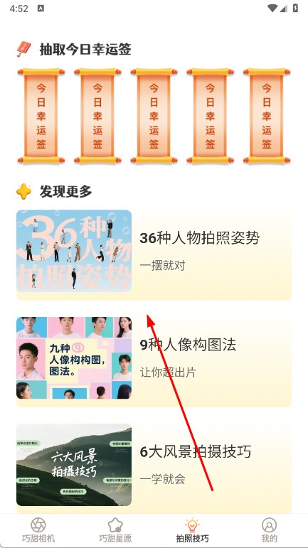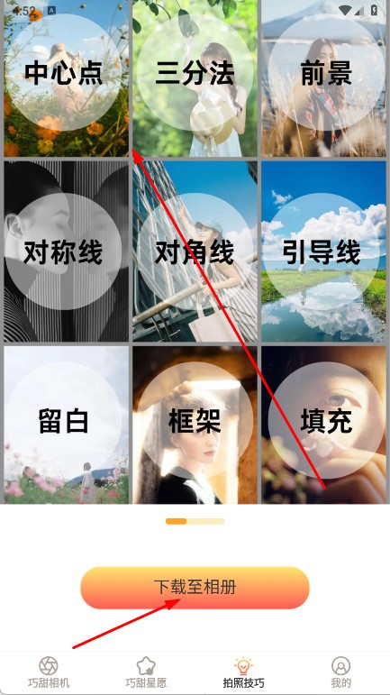 3、進入拍照技巧頁,查看36種人物拍照姿勢等知識,學(xué)習(xí)中心點、三分法等構(gòu)圖,點擊下載至相冊保存技巧圖,提升拍照水平。