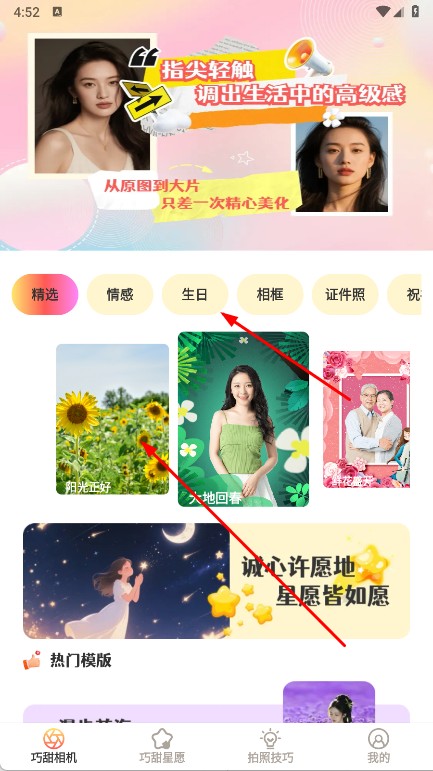 1、打開巧甜相機,在首頁選模板分類,點擊喜歡的模板,可進行人像換背景、美化,制作獨特照片。