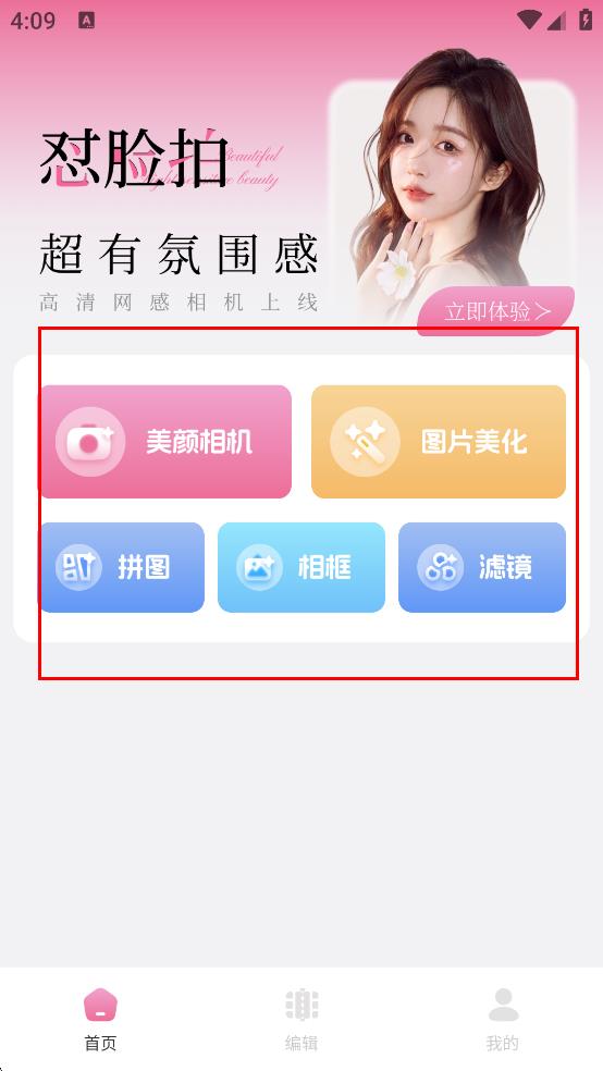 1、按需選【美顏相機(jī)】【圖片美化】功能,用美顏相機(jī)拍氛圍感照片,也可通過拼圖相框?yàn)V鏡,給照片加創(chuàng)意,打造獨(dú)特效果。