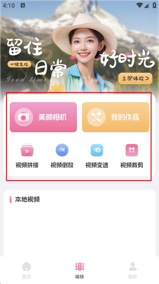 2、點(diǎn)美顏相機(jī)拍視頻,用我的作品存創(chuàng)作,借助視頻拼接,倒放等功能,拼接多段視頻,制作倒放裁剪效果,豐富視頻創(chuàng)作。