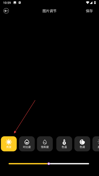 3、進(jìn)入圖片調(diào)節(jié)界面后,點(diǎn)擊左下角亮度圖標(biāo),拖動(dòng)下方進(jìn)度條即可調(diào)節(jié)圖片亮度,完成后點(diǎn)擊保存。