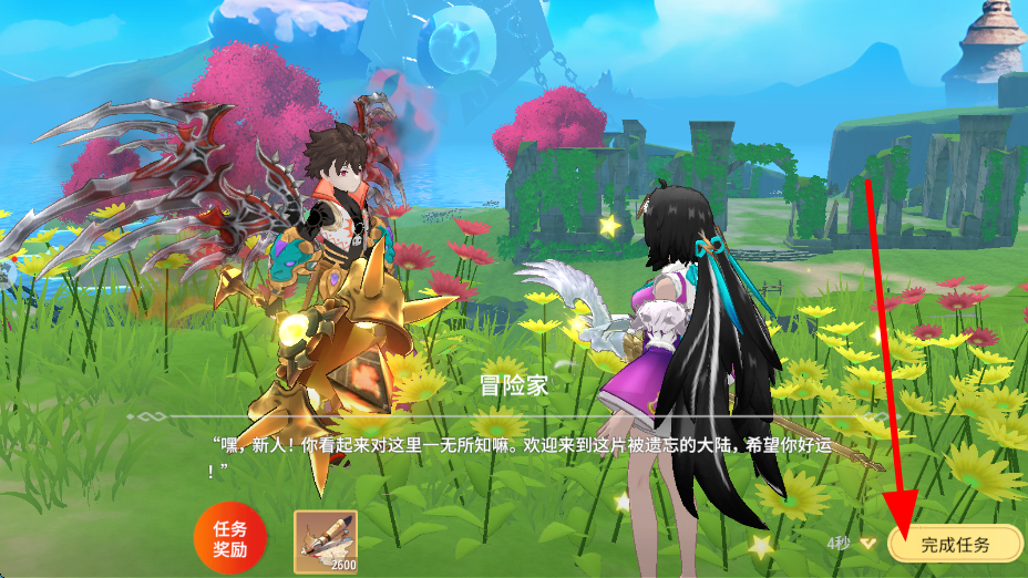 2、進(jìn)入游戲后,會(huì)遇到NPC,與NPC對(duì)話,根據(jù)提示推進(jìn)任務(wù),任務(wù)完成后,點(diǎn)擊完成任務(wù),可獲取任務(wù)獎(jiǎng)勵(lì),助力角色成長(zhǎng)。