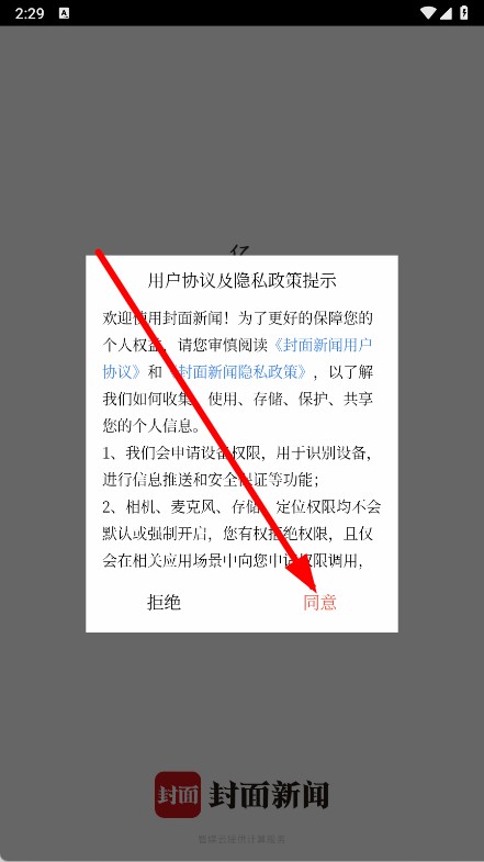 1、打開封面新聞APP,在彈窗中點擊同意。