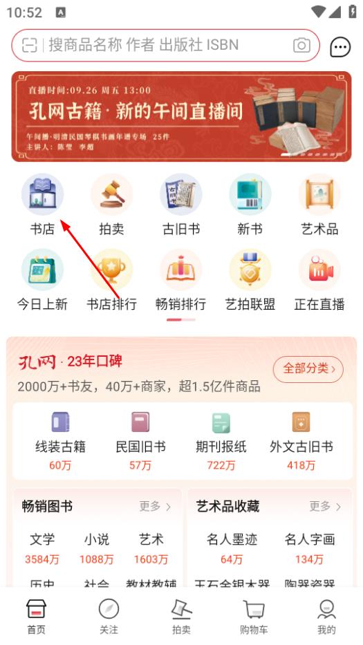 1、打開(kāi)孔夫子舊書(shū)網(wǎng),點(diǎn)擊書(shū)店,進(jìn)入孔網(wǎng)書(shū)店頁(yè)面。