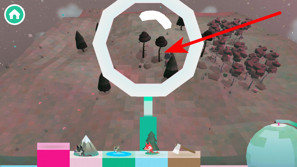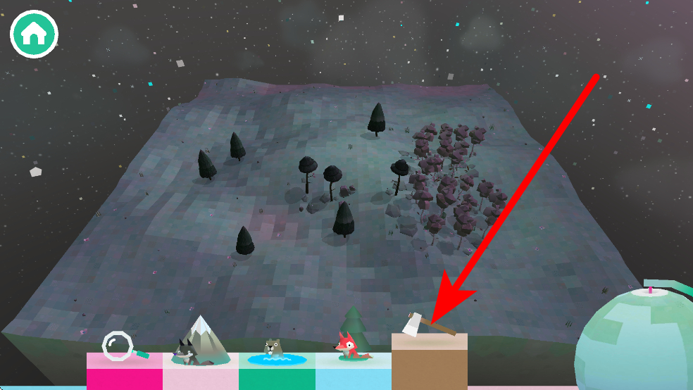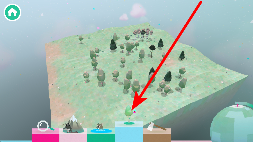 1、進入游戲后,會看到有樹木等元素的森林場景,下方有不同功能的道具,比如綠色方塊對應的樹木道具,點擊該道具,可在森林中生成樹木,為探索營造不同環(huán)境。