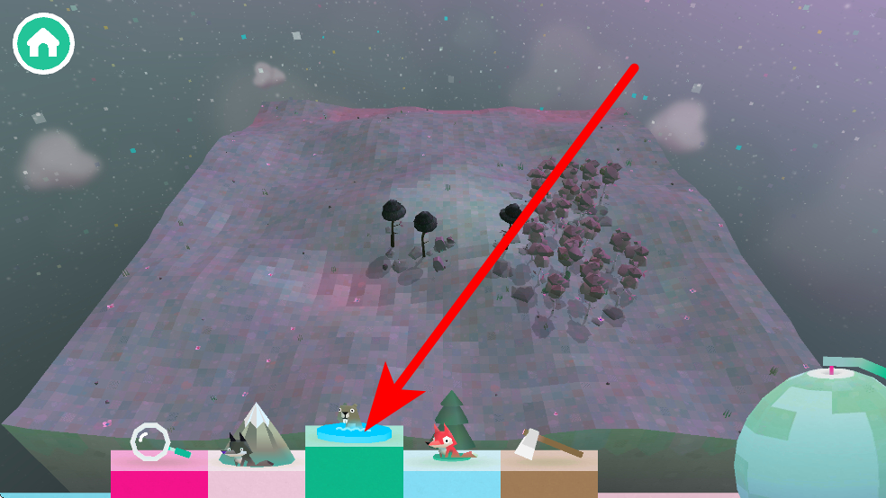 2、還有藍色方塊對應的水潭道具,點擊后能在森林里形成水潭,水潭中會出現(xiàn)小動物,豐富森林里的互動元素,讓探索過程更具生機。
