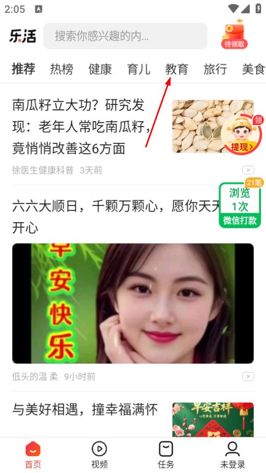 1、打開樂活軟件首頁,點(diǎn)擊教育分類標(biāo)簽進(jìn)入教育分類。