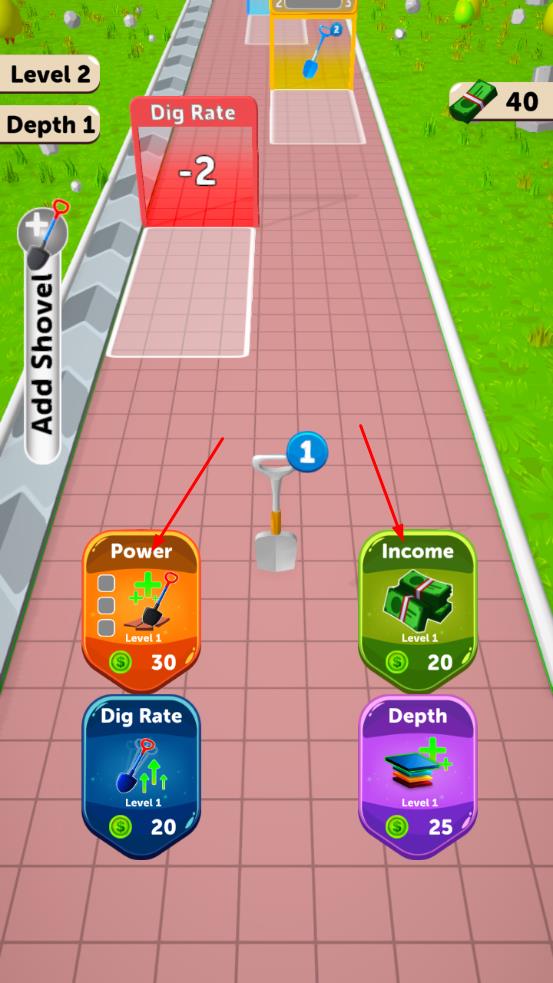 4、在關(guān)卡中,可選擇提升Power、Income、Dig Rate、Depth等屬性。