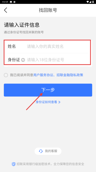 4、在找回賬號(hào)頁(yè)面,輸入姓名和身份證號(hào)碼,點(diǎn)擊下一步按鈕,繼續(xù)完成賬號(hào)找回流程。