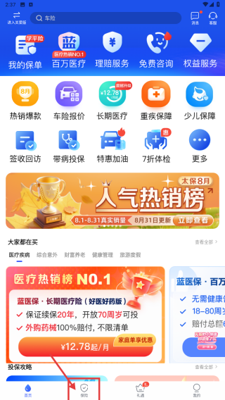 1、打開保險類應(yīng)用,點擊底部保險選項,進(jìn)入保險商城頁面。