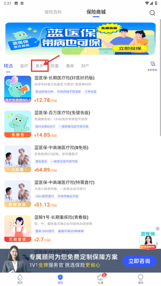 2、在保險商城頁面,點擊意外分類標(biāo)簽,瀏覽意外保險產(chǎn)品列表。