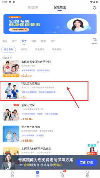 3、在意外保險列表中,找到球類運動意外險產(chǎn)品,點擊進(jìn)入詳情頁。