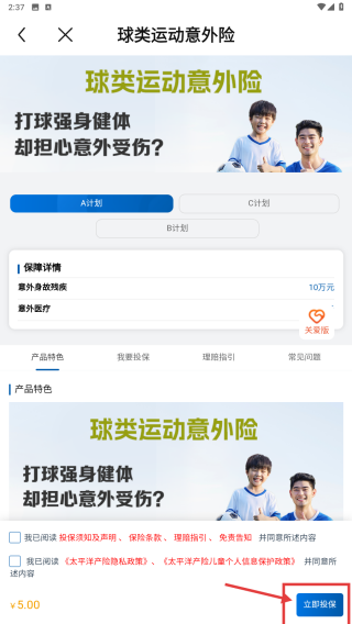 4、在球類運動意外險詳情頁,點擊立即投保按鈕,開始投保操作。